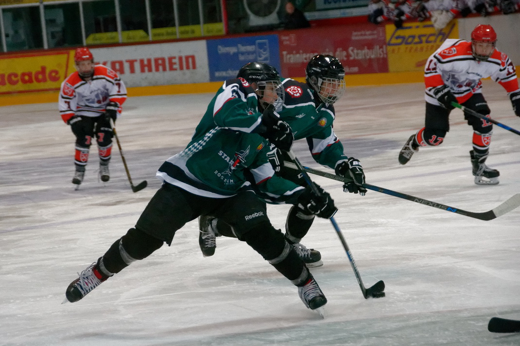 Zum Auftakt in das Mammutprogramm des Endturniers mit vier Spielen in zwei Tagen trafen die Schüler am Samstag Vormittag auf den Krefelder EV. Eine 2:0 Führung der Starbulls glich Krefeld zu Beginn des Mitteldrittels binnen einer Minute aus. Bereits dreißig Sekunden nach dem Anschlusstreffer gingen die Starbulls erneut in Führung, gaben diese dann auch nicht mehr aus der Hand und legten noch drei weitere Treffer zum verdienten 6:2 Sieg nach. Beim zweiten Spiel des Tages am Samstag Nachmittag wartet dann der ESV Kaufbeuren. Bis Mitte des zweiten Spielabschnitts erspielte sich das Team um Topscorer Lukas Reichel eine beruhigende 3:0 Führung ehe Kaufbeuren mit zwei Toren den Anschluss herstellte. Durch einen Doppelschlag zu Beginn des Schlussabschnitts stellten die Starbulls erneut eine drei Tore Führung her. Kaufbeuren gab sich aber nicht geschlagen und machte die Partie durch zwei weitere Treffer nochmal spannend. Auf den Treffer zum verdienten 6:4 Endstand durch Torjäger Ludwig Danzer konnte Kaufbeuren dann keine Antwort mehr geben. Durch die beiden Siege und vor allem dadurch dass die Starbulls auf Anschlusstreffer der Gegner postwendend eine Antwort parat hatten gab der Mannschaft viel Selbstvertrauen und den Glauben an die eigene Stärke.